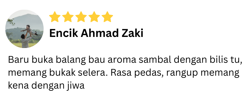 Kami berikan jaminan ini kerana kami yakin sambal bilis homemade ini memang rangup, pedas manja, dan wangi pengalaman yang telah dicuba dan disukai ramai. Tiada risiko, cuma nikmati sambal bilis kegemaran anda dengan tenang.